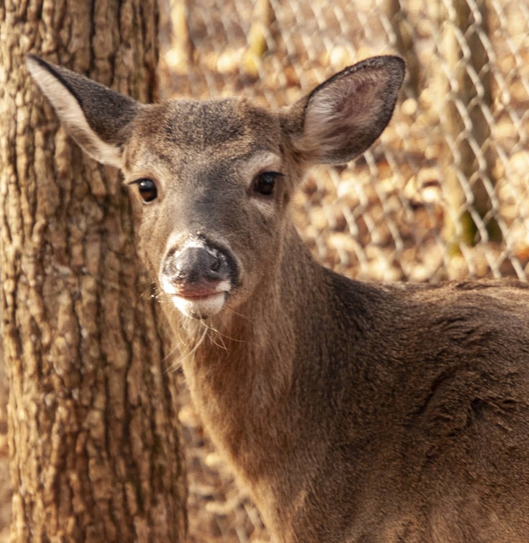 Christine’s Story: Christine was named after the rehabber that drove hours to transport her to us. She is completely blind because was born without eyes. Her mother must have been an awesome mother to not have abandoned her at birth which usually is what happens. She was found alone at two weeks old. That is the age that fawn start following their mother instead of just bedding down, so I think this is when they lost track of each other. Her mother also taught her “stranger danger”. It took weeks of her kicking and fighting me and many bruises everytime I had to give her the bottle but one day she finally trusted me enough to take the bottle. She would follow my voice to drink her bottle. Once she was weened she never wanted to be touched by humans but she does love to be groomed by the other deer. So we just leave her be, no touching and I just talk to her so I do not startle her if I need to be near her. God gave her extra big ears to help her navigate. When I talk to her, she follows my voice using those ears like sonar. She is a sweet, beautiful girl.