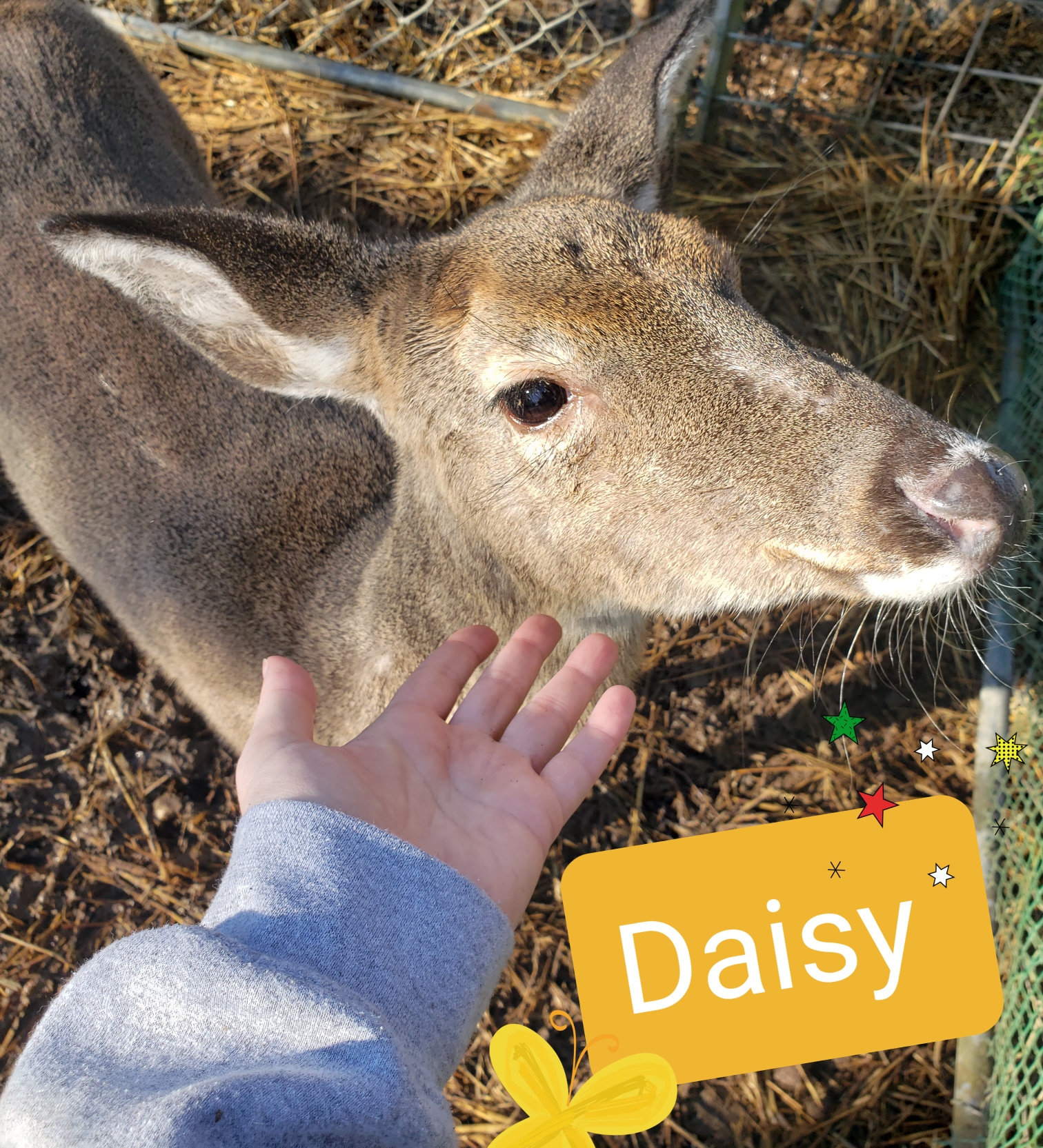 Ester was found after a doe was hit by a car. She imprinted on her finder and then her finder moved. She has a forever home at Magnolia Fawn Rescue.