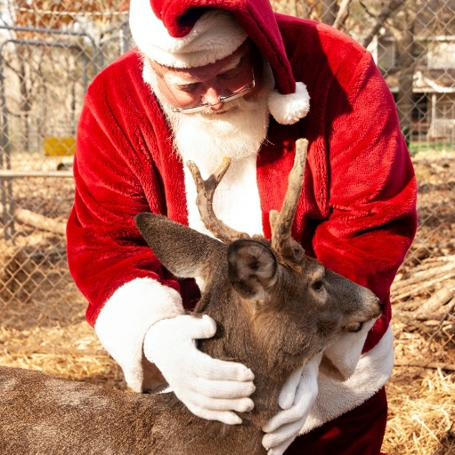 Rudolph’s Story: He showed up at someone home last Christmas. He went up to their very young son and was pushed his antlers towards him. He was wanting to be pet but at the same time beginning the rut and rubbing his sharp antlers onto everything. This is a very dangerous time for young pet bucks. They have no fear of humans and are losing their velvet and will gore anything they can because of raging hormones. No one ever claimed to have raised him but I am sure his behavior scared them enough to set him free. But this could have ended very badly, the boy could have been hurt or killed and SCDNR would have had to shoot Rudolph. Thankfully we were called and he was neutered to calm the hormones. Now he is safe and so is the public. Without the hormones, he is a sweet boy.